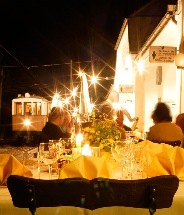Gastronomische NachtfahrtenAn fünf Sommerabenden findet eine kulinarische Nachtfahrt mit der Rittnerbahn statt. Genießen Sie ein Feinschmeckermenü mit den dazu passenden Weinen. Wie funktionierts? In Oberbozen steigen Sie in den historischen Jugendstilwagen der Rittner Bahn und fahren bis nach Klobenstein. An jeder der fünf Haltestellen werden Sie von Rittner Gastwirten kulinarisch verwöhnt. Die Nachtfahrt wird von einem Ensemble musikalisch begleitet.mehr erfahren